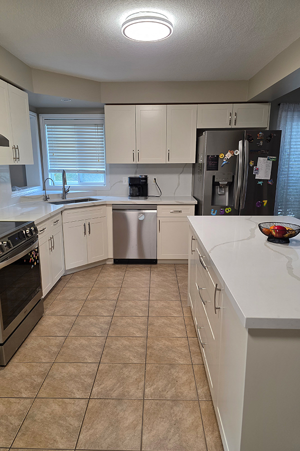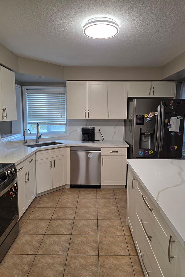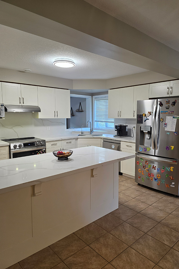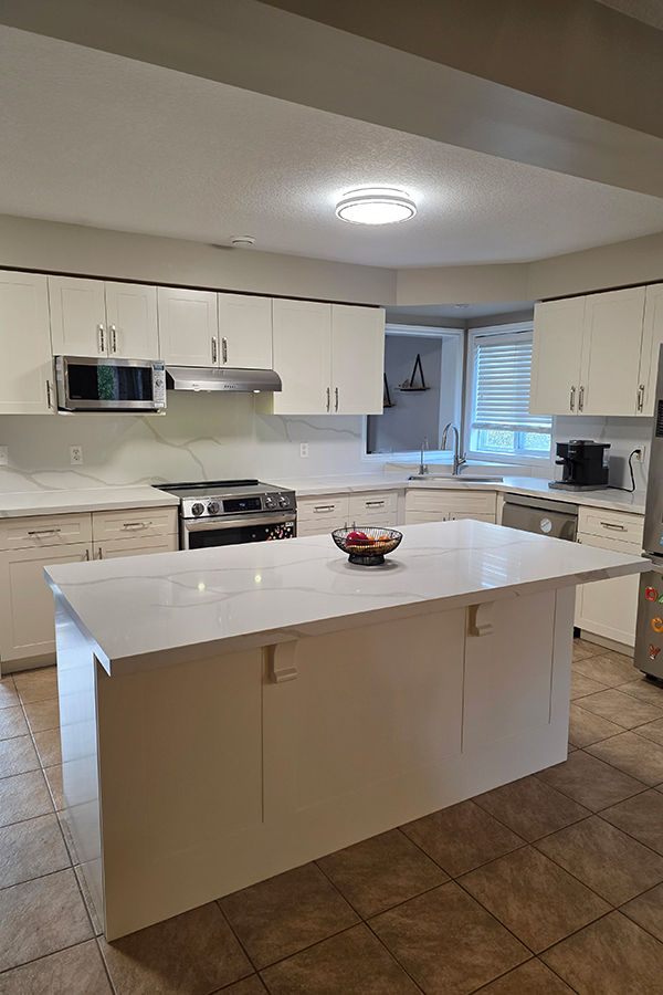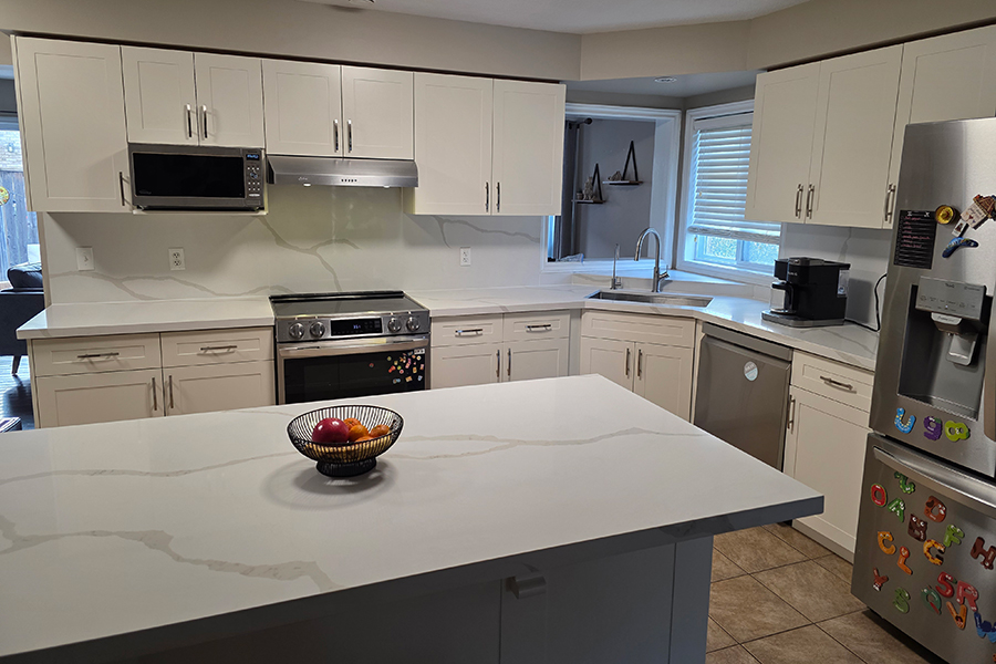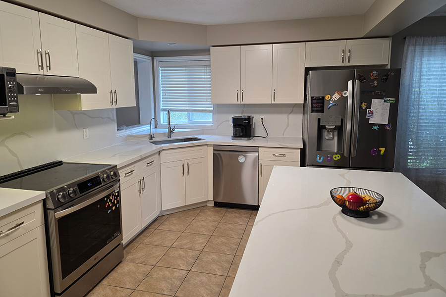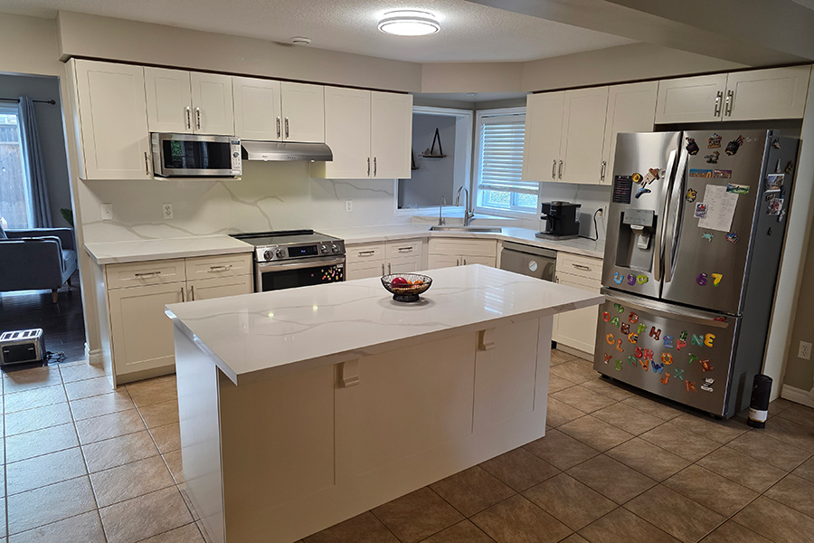 This Guelph kitchen received a modern transformation through professional cabinet refacing, giving the space a brand-new look without a full renovation. With Painted HDF Shaker-style Doors, a fresh White Down color, and a premium Quartz Countertop & Backsplash, the kitchen now looks elegant, bright, and timeless.