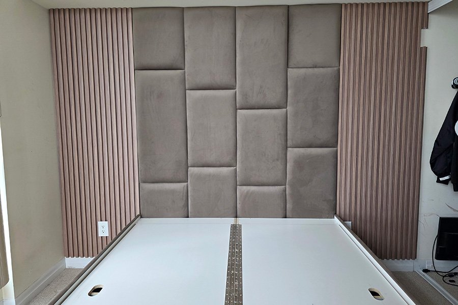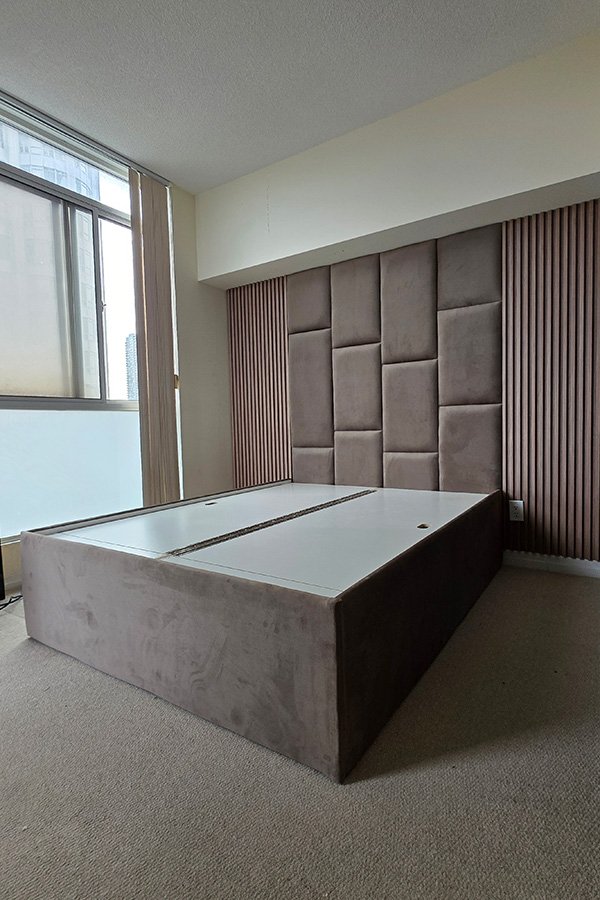 This custom bedroom project in Mississauga features a luxurious fluted panel accent wall upholstered with rich fabric, creating a soft, textured focal point. Complementing the wall are custom-built storage boxes, thoughtfully designed and finished in matching fabric for a cohesive and elegant look. This bespoke setup blends modern design with functional elements, delivering a serene and stylish bedroom experience.