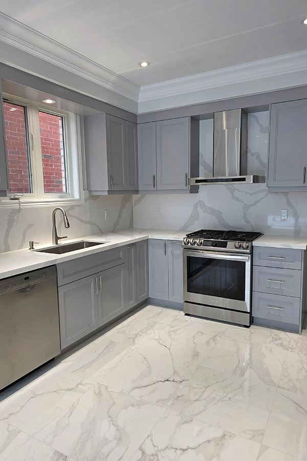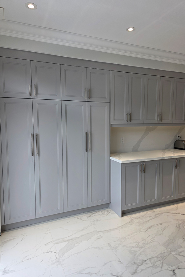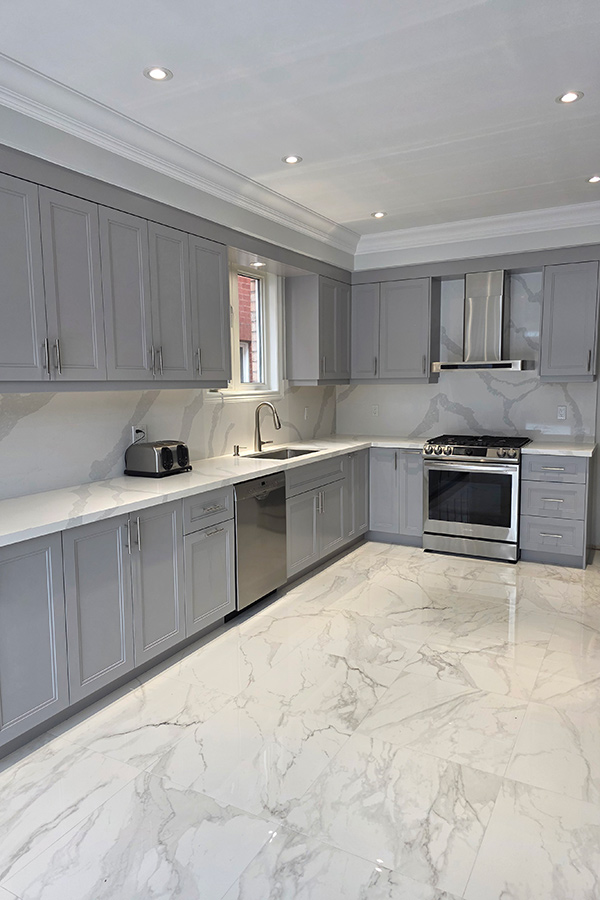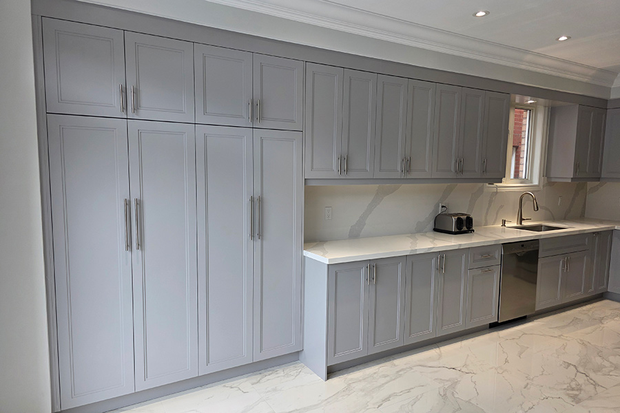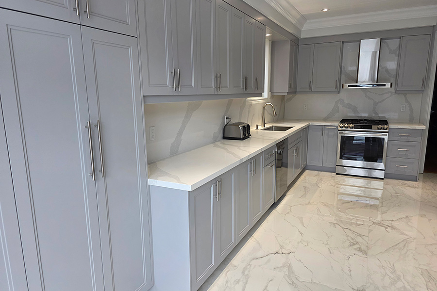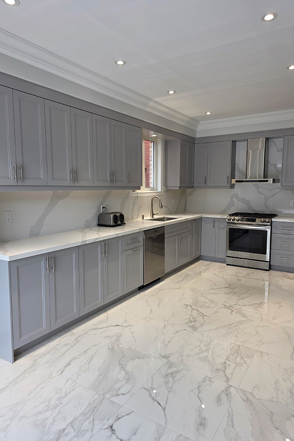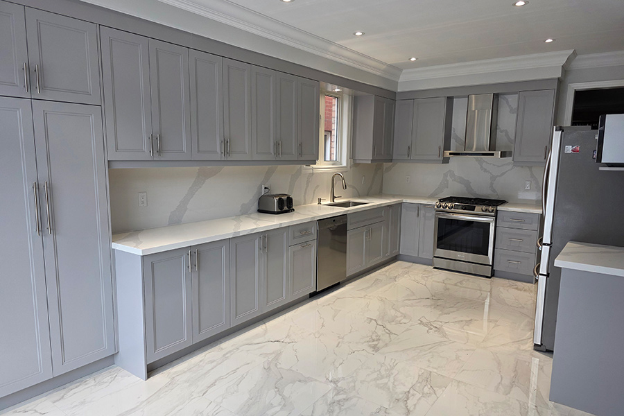 This modern kitchen renovation in Brampton, Ontario features custom kitchen cabinets designed for both style and functionality. The kitchen showcases painted HDF step shaker-style doors finished in the rich and contemporary shade Stormy Monday, paired with a seamless quartz countertop and backsplash for a clean, upscale look.